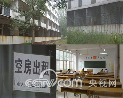 在大学城的学生宿舍区,记者看到一栋又一栋空置的宿舍楼,旁边已经是杂草丛生,而宿舍楼附近的店铺门窗上,也已贴上了招租的字条,随着生源减少,各学校间的竞争又变得更加激烈,民办院校进一步陷入了恶性循环。