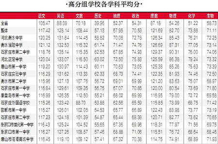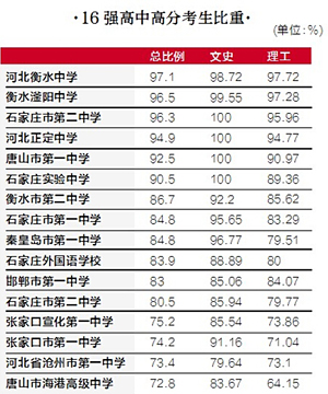 在省教育考试院公布的“2014年高分组学校考试情况统计表”中,衡水中学、滏阳中学、石家庄二中1等16所省内知名高中入围,堪称今年高考的省内16强学校。