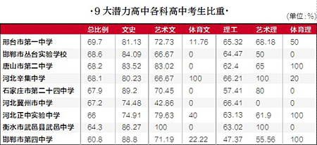 从数据来看,邢台市第一中学高分考生比重为69.7%,距离“高分组学校”资格只差了0.3个百分点。此外,9所“有潜力高中”里,来自石家庄的辛集中学、市24中和正中实验中学占去3个席位,比重达三分之一,再次显示了石家庄知名高中整体偏多的格局。 |