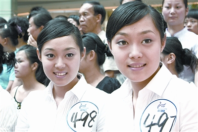 沈阳姐妹花赵紫辰、赵紫彤一路走来很顺利。姐妹俩身高165厘米,发型、衣着完全一模一样,都是沈阳航空工业学院空乘专业大二的学生。这次不远千里从沈阳赶到武汉,就是为了圆蓝天梦。