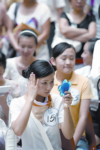 昨(10)日的南航“空姐招募大汇”现场,“陪考团”也是一景。陪伴的父母、亲友等,自发组织起来,顺着队伍站成一排维持秩序;还有的父亲带着DV,现场记录女儿参赛。