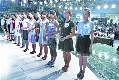 许多空乘专业的选手更是拖着行李箱报名,箱子里有专用化妆品、丝巾、发卡等,她们着装避开空姐服,但是着装统一白衬衣,黑裙子,一身职业装打扮,很是抢眼。