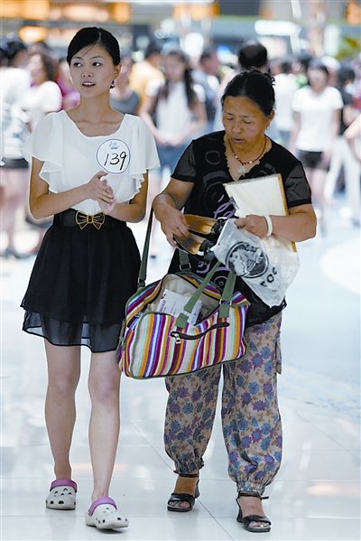 一名选手完成测试,连忙换上舒适的拖鞋,将高跟鞋交给老妈。记者 李少文 实习生 高隆 李福生 摄