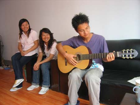 闲暇时间大家围坐一起弹上一曲吉他,又象回到了校园生活。