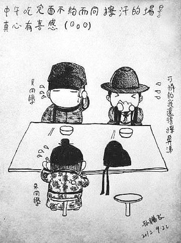 “感冒牙疼流鼻涕……难受”“从学校出发,我和苏州的同学骑行两小时”“中午吃完面不约而同擦汗的场景真心有喜感。”近日,百度贴吧里出现了一系列有趣的手绘图片受到网友热捧,甚至有人提议“出本集子”。这些图片从9月份开始,每天一幅,像日记一般,描述一个穿着汉服的小伙子的日常生活情景。