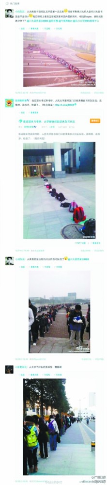 “大学生自习排队要逆天!”这条微博火了,12月份至今的转发量直逼7万。全国各地的高校大学生不断微博称,为求得一个复习座位,不得不拿出书包、书本、杯子等各种占座神器。