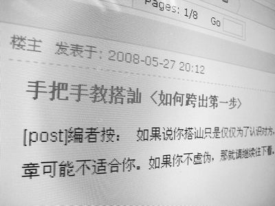 “这是一种新的交友方式,简单、直接、真诚、礼貌,这是搭讪的八字方针。”“猫心肠”介绍,最好的搭讪方式就是直接告诉对方你想认识他(她)。“一旦对方拒绝,要礼貌地退下,绝不纠缠。”还有“最好在人比较多的地方”、“跑过去询问既显郑重,又显真诚”,“身体接触给人不好的感觉,为搭讪中的大忌”。