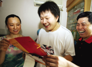朱凯(中)及家人正高兴地查看录取通知书。(记者 刘军 摄)