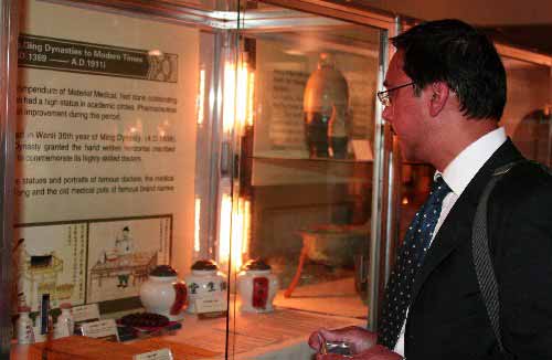 资料图片:7月28日,在英国伦敦皇家医学会,一名观众在英国中医药周活动上参观中医药实物展。 新华社记者 谢秀栋 摄