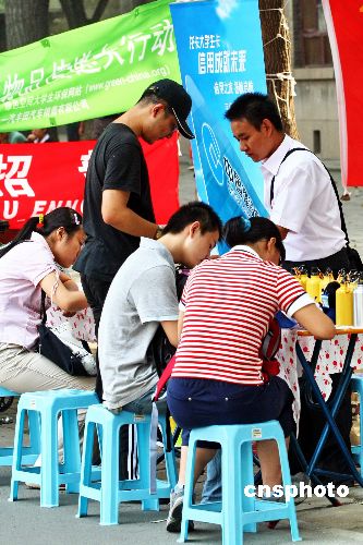 资料图片:在北京大学等高校内,办理无保学生信用卡的银行越来越多,本科生和研究生透支额度可达三千至五千元人民币。中新社发冯昕