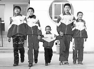 龚民(中)和高三同学在一起,明显成了“小不点”。资料照片