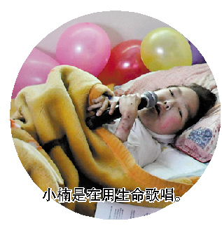 目前,小楠的妈妈已辞职,全职照顾她,小楠家里已经花掉了20多万元的医疗费。尽管遭受着难言的痛苦,小楠有着爱笑、喜欢放声歌唱的开朗性格,这成了支撑一家人前进的动力。