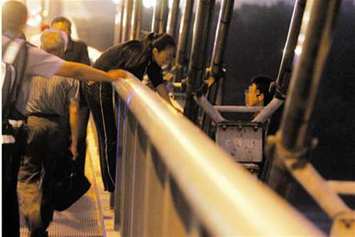 前晚7时20分,记者在长江二桥上看到,一名戴眼镜的男青年站在大桥护栏外,四五名警察和几名学生模样的青年正在劝说该青年,桥下停着一艘水上公安的快艇。该青年不停在桥边来回走动,让人提心吊胆。路人表示,这么年轻的孩子就想跳桥,实在可惜。