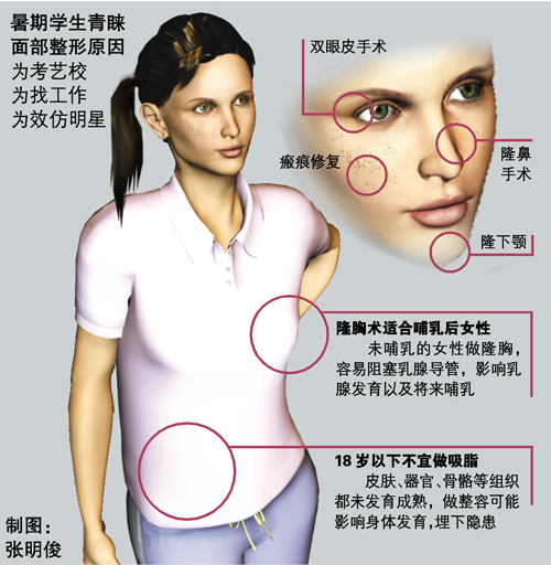 “我们每天几乎都要做60多台整形手术,而其中近半都是为学生实施的。”江苏施尔美整形医院的一位何姓工作人员告诉记者,进入暑期以来,有越来越多的高中毕业生来咨询和预约各类整形美容手术,他清楚地记得,高考结束后的第二天,他们医院就一下子接到了30多个学生的美容整形咨询电话。