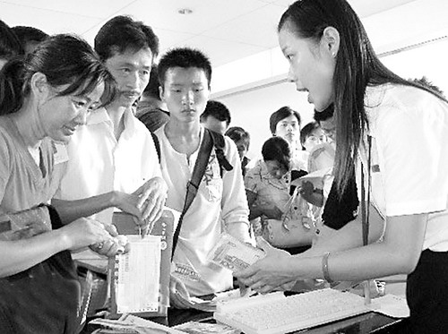 随着国家教育政策进一步向促进公平倾斜,中国教育提速迈向公平的足音清晰而坚定。图为新生和家长在苏州大学新生报到点交学费。苏州大学为贫困新生先办理入学手续,再帮助其申请助学贷款及联系勤工俭学项目。新华社发