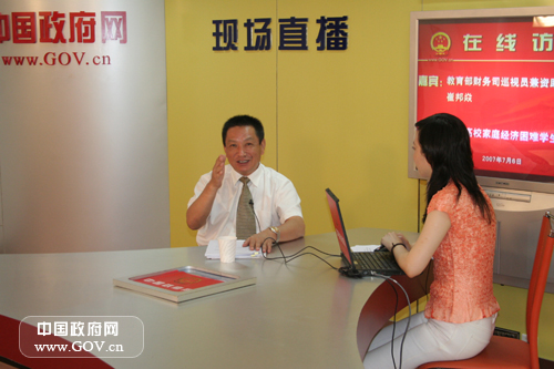 [教育部财务司巡视员兼资助中心主任 崔邦焱]网友朋友们,大家好。主持人好。 [2007-07-06 10:07:27]