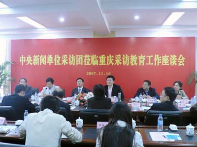 11月10下午,教育部中央新闻单位采访团一行参加了重庆市教委教育工作座谈会。重庆市委教育工委书记、教委主任彭智勇(正排左三),重庆市教委副主任牟延林(正排左二),教育部办公厅副主任兼新闻办主任王旭明(正排右三),重庆市教委副主任赵为粮(正排右二),重庆市委教育工委副书记邓卓明(正排右一),以及重庆市教委副主任钟燕(正排右一)等领导出席座谈会。颜金花 摄