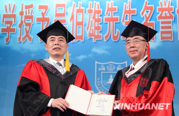 5月31日,南京大学授予吴伯雄法学名誉博士学位,南京大学校长、校学位评定委员会主任陈骏(左)向吴伯雄颁授学位证书。