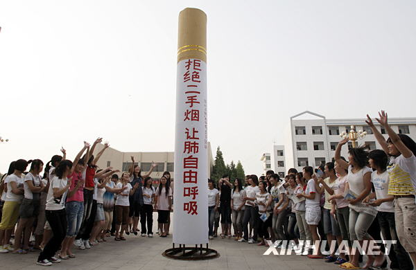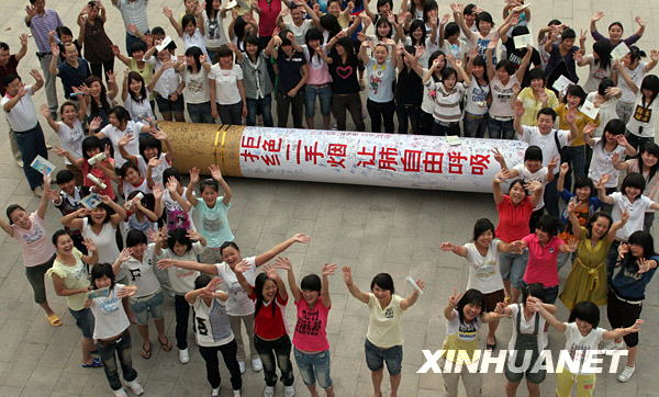 5月30日,淮北卫生学校的学生竖起自己制作的巨型“香烟”。新华社发(李博 摄)