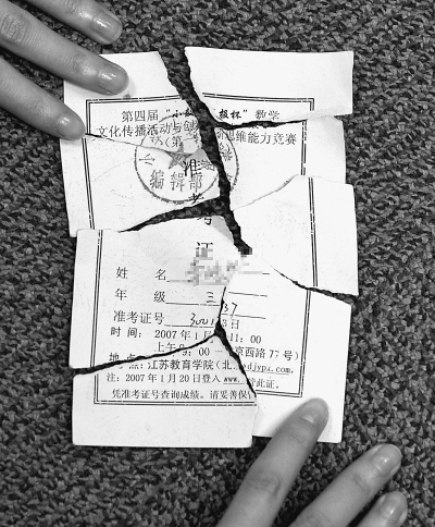 ④某奥数考场混乱,找不到考场的家长,撕掉准考证,愤然离去。(人民图片)