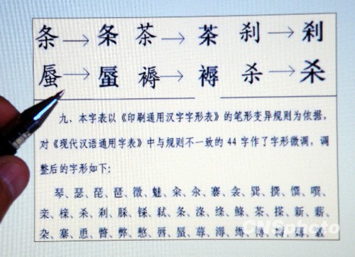 2009年8月20日,据悉,中国教育部近日就刚研制的《通用规范汉字表》(征求意见稿)面向社会公开征求意见,其中44个汉字的新写法引起网友反对声一片,认为此举纯为“折腾人”。(如:“琴”字左上角“王”字最后一笔由“横”变成“提”;“唇”字的厂字头由半包围结构调整成上下结构,“亲”“杀”等字底下“竖钩”改为“竖”......)。中新社发 刘君凤 摄
