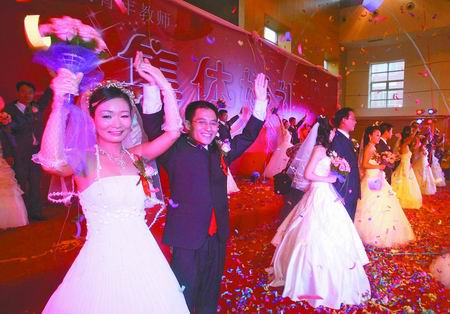 昨日上午,郑州外国语学校举行了一场热闹的“教师集体婚礼”,12对新人中几乎全部是老师。 “有两对新人是我校的老师,其他的新人中,每一对中有一位是我校的老师,很多人的配偶也是老师。”该校有关负责人介绍,婚前准备工作繁琐,平时教学工作忙碌的老师几乎很难有时间准备。“为了给老师们减轻负担,学校决定为结婚的年轻教师们举行集体婚礼,负责婚礼上的化妆、花束、酒席等‘后勤’工作。” “我现在很激动,毕竟是自己一生中最重要的日子。”新娘子曹艳鹤说,她是该校初中部历史老师,和新郎已经恋爱12年,平时因为工作繁忙,婚事就一直往后拖。“学校很为我们考虑,除了衣服其他东西基本上都是学校提供的,最重要的是和同事一起分享快乐,在教师节结婚,觉得很幸福。” “教师的岗位特殊,每名老师有自己的工作职责,即使是结婚,婚假也很难按照国家规定的时间休息。”学校有关负责人介绍,由于课程紧,学校只为每名老师放了3天婚假,休完婚假马上就要进班上课。 据了解,这是郑州外国语学校在教师节为年轻教师举行的第三届集体婚礼,自2007年至今,三年来学校共为43对“教师新人”举行了集体婚礼。