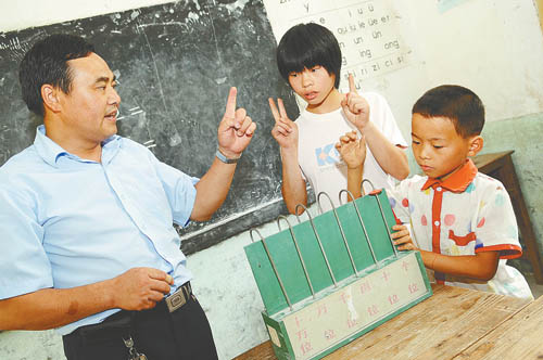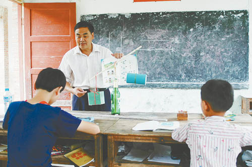 他每天都要绞尽脑汁来调动课堂气氛。在上午一节教轻重的数学课上,陈老师用一个废旧的啤酒瓶,两边用尼龙绳捆绑了教学用具,分别是圆锥体和正方体,以此来展示。何国华想了半天,才扭扭捏捏地举出了桌子和椅子的例子,“桌子重,椅子轻”。何国香则拿出语文书和铅笔盒,放在手中掂量掂量,迟疑了一会儿,说语文书更重。