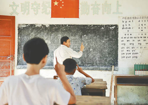 这天早上,单是为了教这4个韵母,他就花费了两节课的时间。他分别用红粉笔和白粉笔写在黑板上,一点一点地纠正发音:“嘴巴不要圆着,要扁一点!舌头往上,不要翘得太多!”可惜台下两个孩子反应总是很慢,他们总是一脸茫然地看着老师,回答也常常出错。