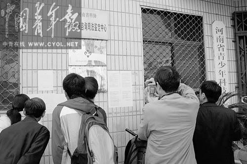 10月13日上午,全国中学生物理竞赛委员会公布了“关于全国中学生物理竞赛河南赛区复赛理论考试结果的调查报告”,很多考生和家长聚集在河南省青少年科技中心看调查报告。 记者 田国垒摄