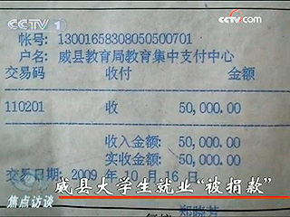 央视《焦点访谈》2009年10月27日播出“河北威县教育局录用191大学生后强行要求捐款 ”,以下为节目内容实录: