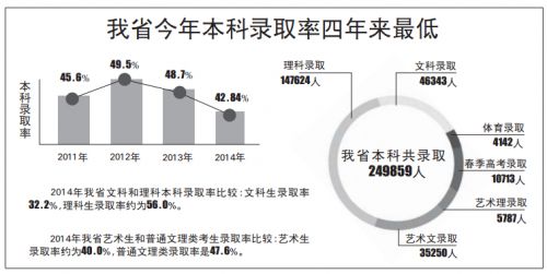 2014年山东省普通高校招生本科层次共录取考生249859人,其中,文科录取46343人,理科录取147624人,体育录取4142人,艺术文录取35250人,艺术理录取5787人,春季高考录取10713人。记者比较发现,2014年山东高考录取率4年来最低,而且连续3年呈下降趋势,这表示普通文理类学生考上本科的难度,近几年一年比一年大。