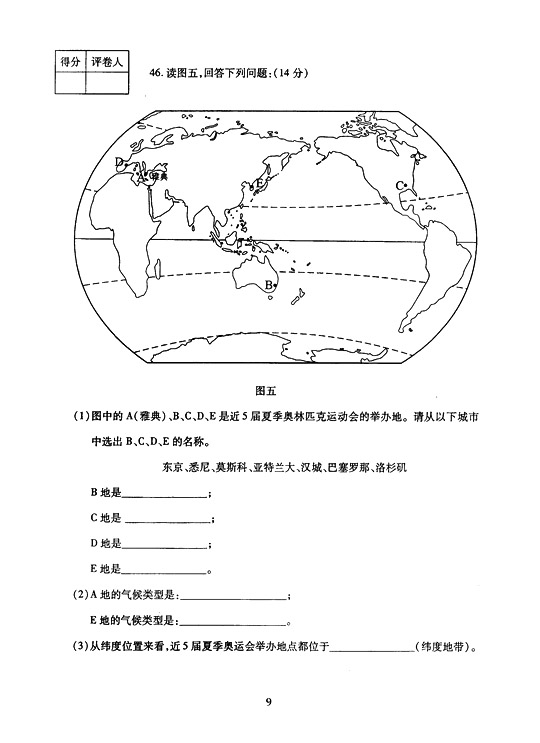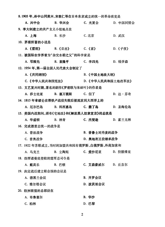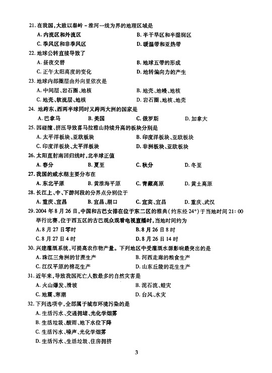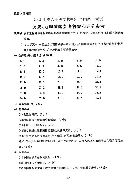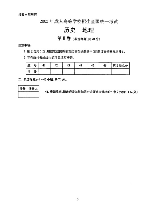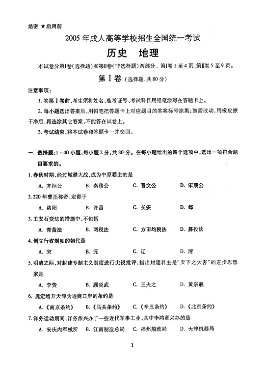 2005年全国成人高等学校(高起点)招生统一试卷及答案—历史地理