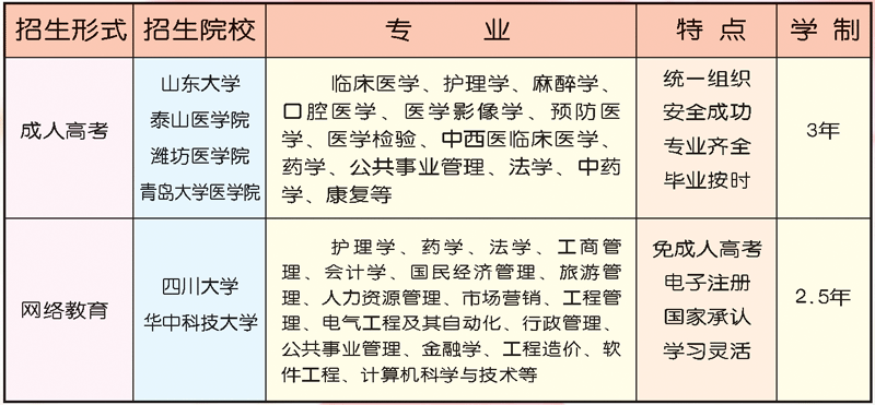 军事化管理特色护理班招生简章 我校面向初高中学生举办普通大中专军事化管理特色护理班学生在校期间实行准军事化封闭式管理培养学生的部队意识、品德和素质努力养成遵守纪律吃苦耐劳、奋发向上的工作作风和精神风貌。 涉外护理专业招生简章 为贯彻教育部卫生部颁布的涉外护理专业培训方案积极参与国际护理专业领域技能型紧缺人才培养的宏伟工程我校自 2005 年开始针对不同层次的学生率先开办涉外护理(国际护士)专业并取得了较为成功的经验已有 100 多名毕业生踏出国门走向世界学校计划将继续招收普通中专和三二连读大专层次涉外护理专业 2010年大学专科班招生简章 根据山东省教育厅和卫生厅文件精神我校今年面向全国招收高中起点医药卫生类专业大学专科班。学生通过正规全日制在校学习在 3 年的时间内完成学业通过套读普通高校的一成人或网络教育取得大学专科学历学生毕业时可同时取得大学专科毕业证和普通中专毕业证国家承认学历。学校负责安置就业并提供不少于 3 次的就业机会。 成人高等教育招生简章